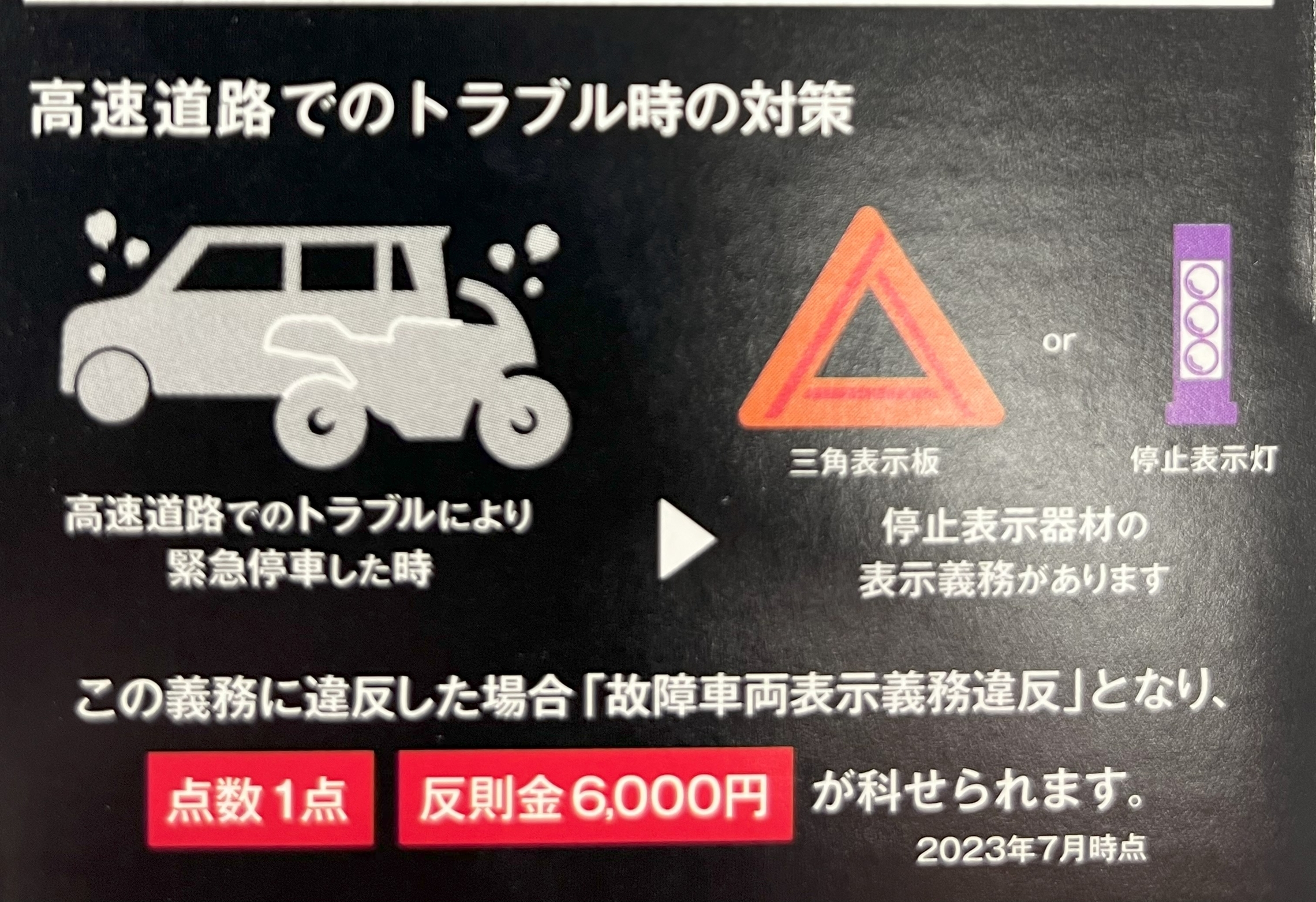 一般的な道路でもそうですが、特に高速道路での緊急時に有効なアイテムになります(高速道路では、やむおえない停止車両であっても停止表示義務という法律があるんですよ Σ(・□・;))