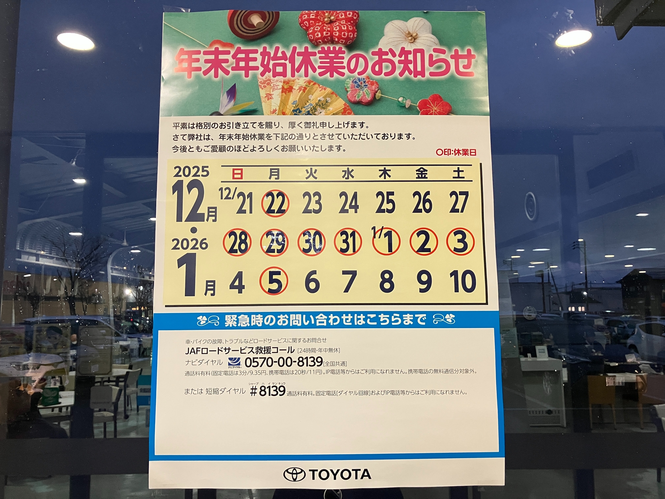 当社の今年の営業は12/27で終わりとなり、来年は1/4からの営業開始となります