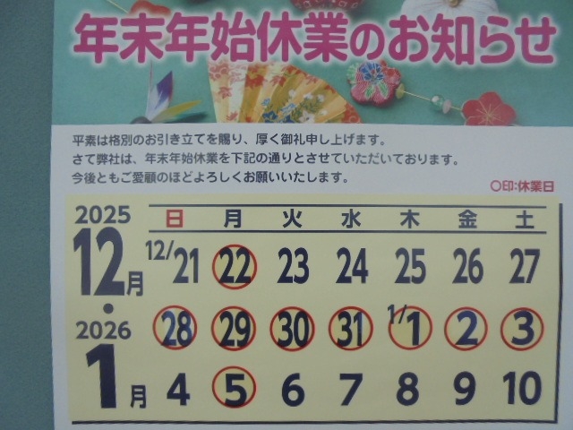 12/28(日)~1/3(土)まで休業させていただきます。