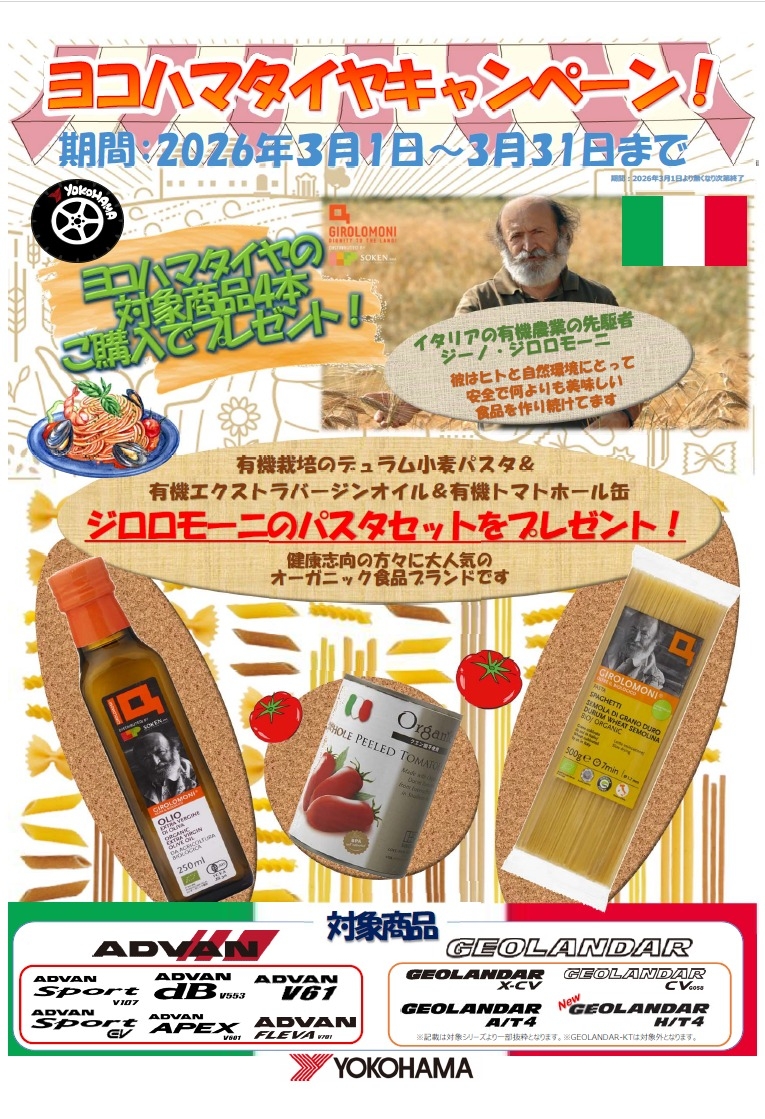 対象のタイヤをご購入いただいたお客様に、【ジロロモーニのパスタセット】をプレゼント🍅🍝