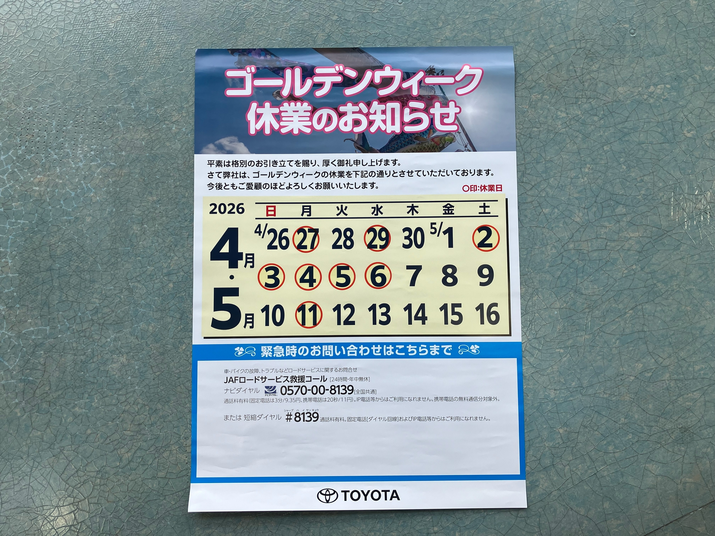 お休みの期間中事故・故障・トラブル等がございましたら、JAF 0570-00-8139 または #8139 へご連絡ください。